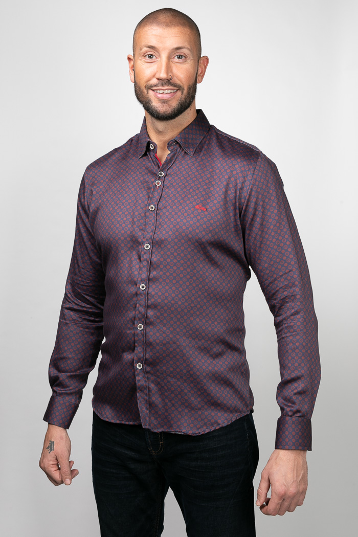 A navy background with a burgundy/red circular pattern check giving this shirt a beautiful contrast, our friends at Dario Beltran really do know how to make beautiful shirts.