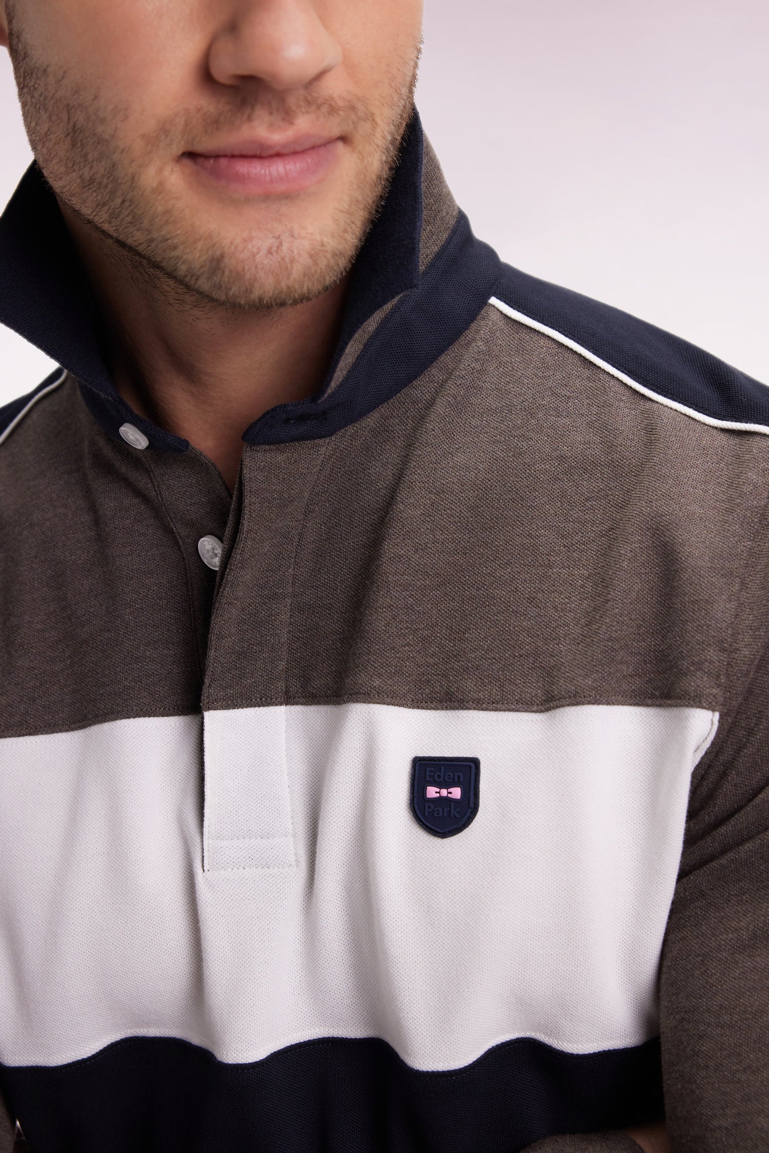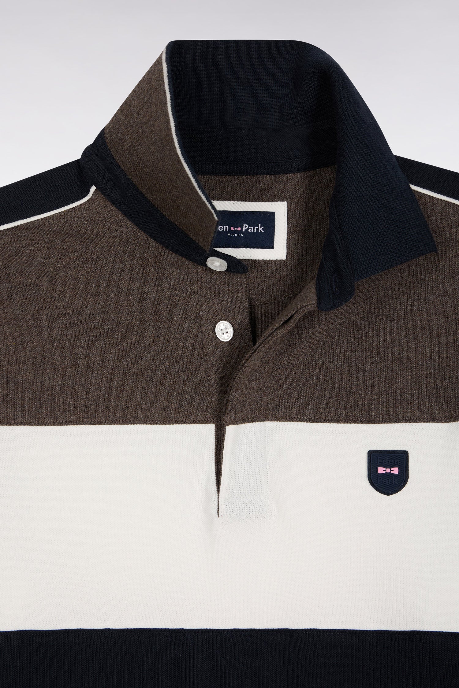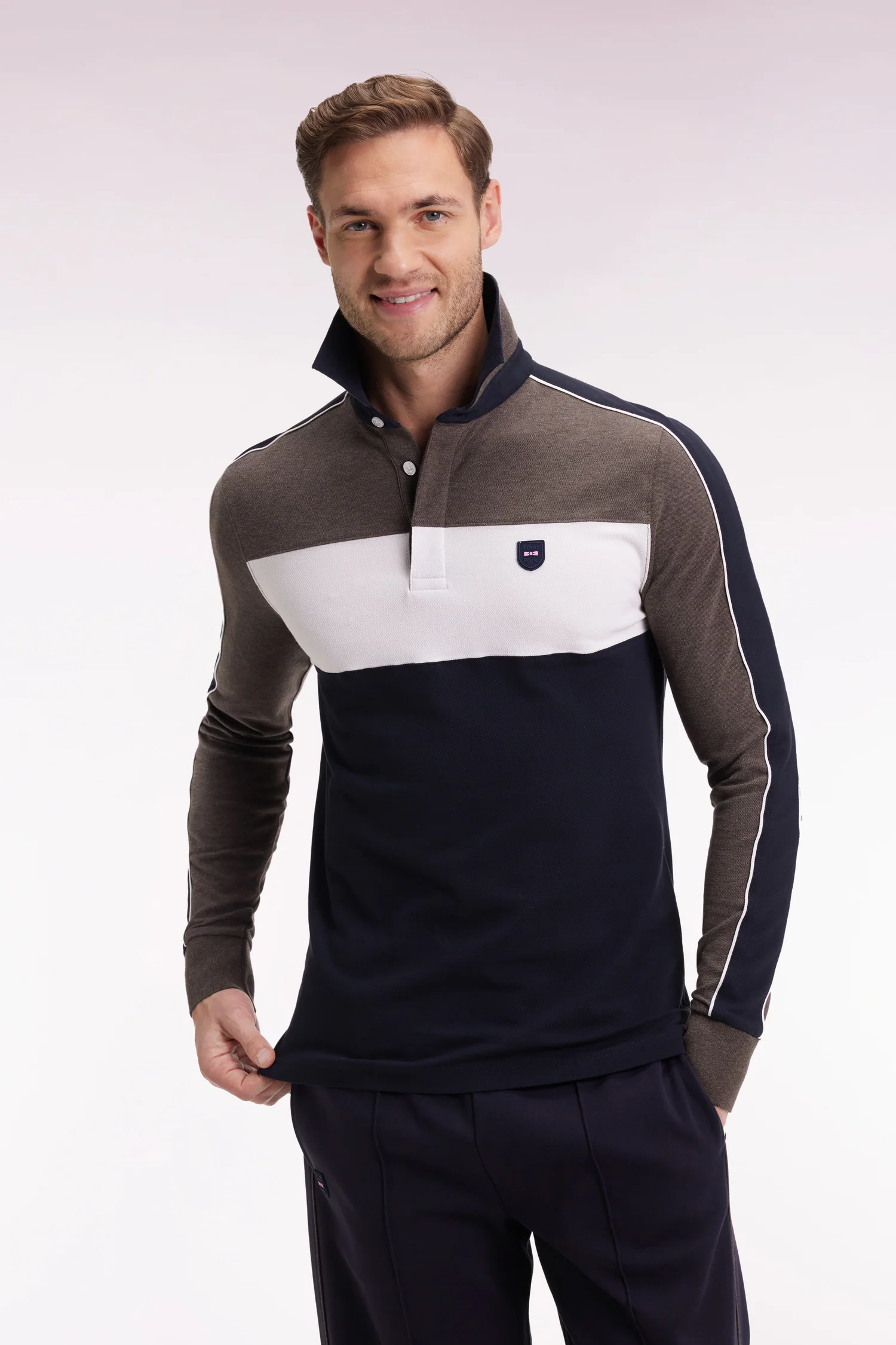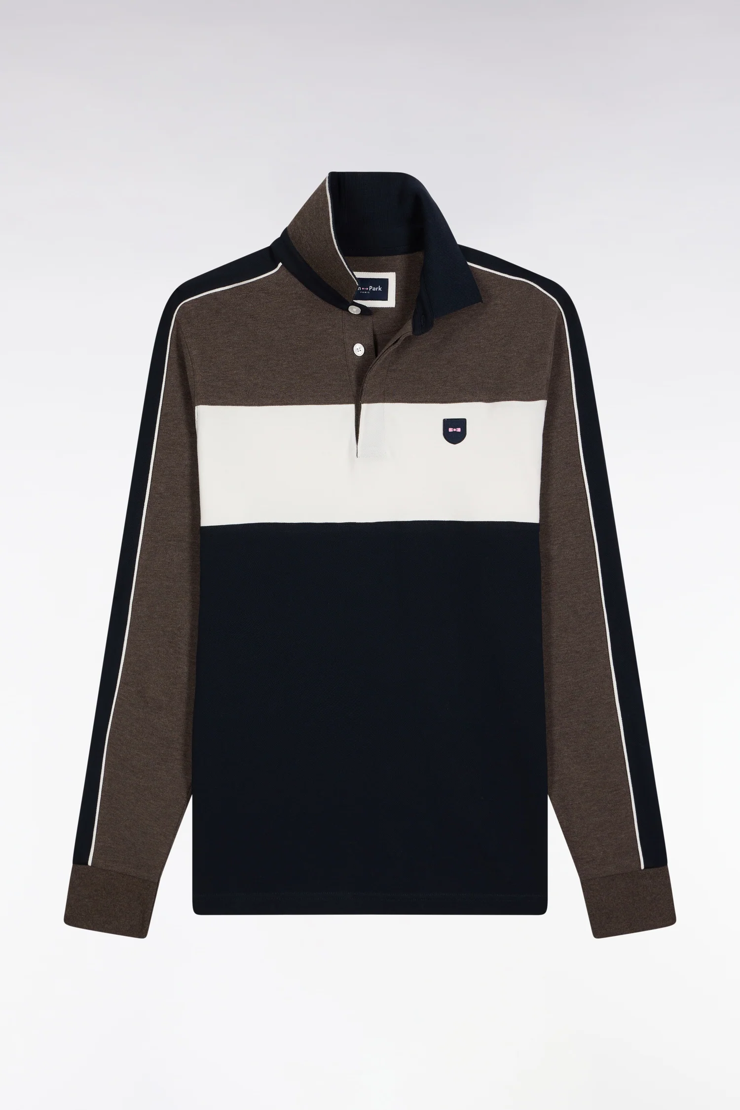 This long-sleeved polo shirt in soft and breathable stretch cotton piqué revisits an Eden Park classic with contrasting finishes that make the difference. Its polo collar and slim fit ensure a clean silhouette, while its cut-and-sew cutouts enliven the silhouette with dynamism. A silicone emblem badge completes this sporty-chic model with a graphic twist, available in 4 autumnal tricolor variations, easy to coordinate with this season’s wardrobe.