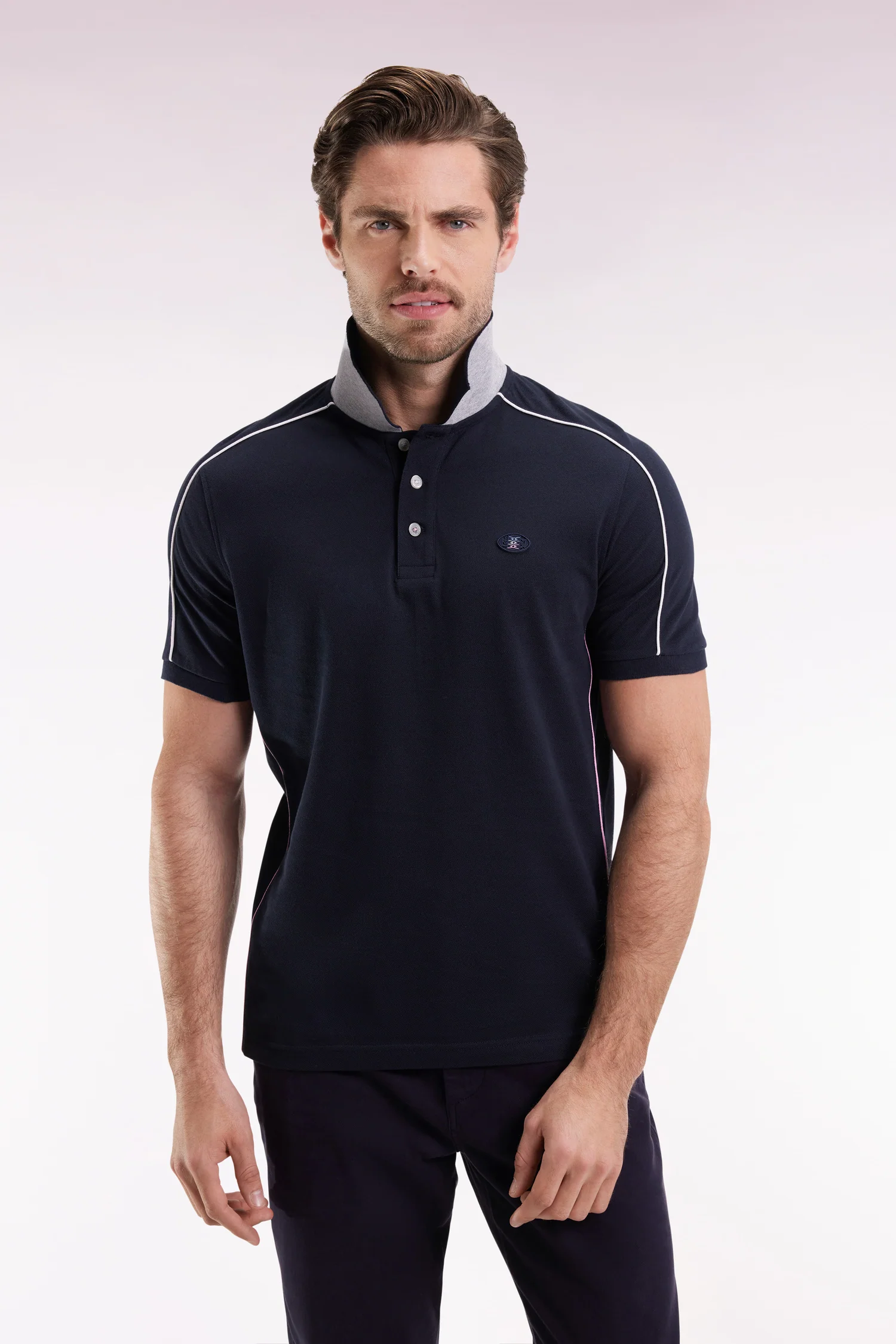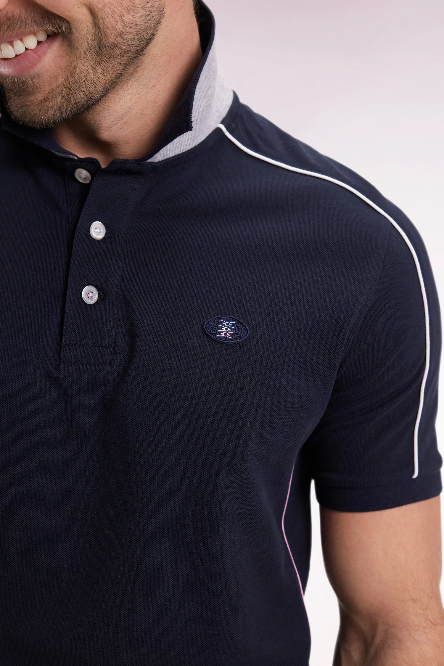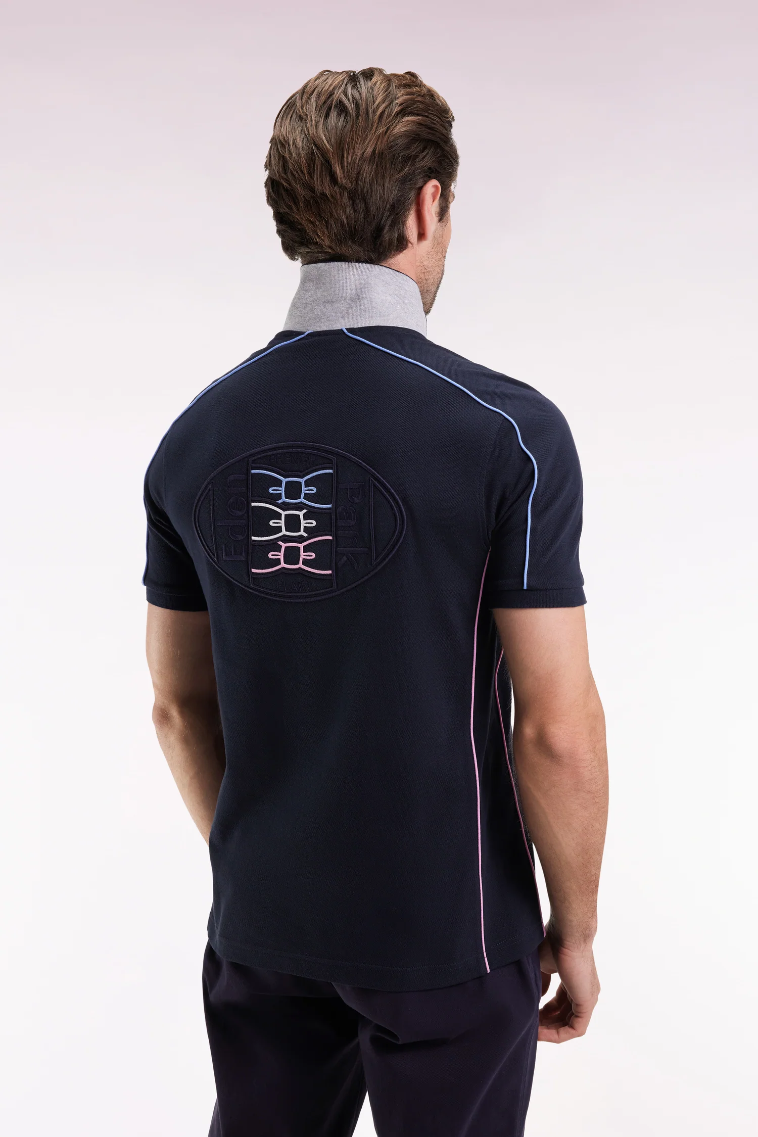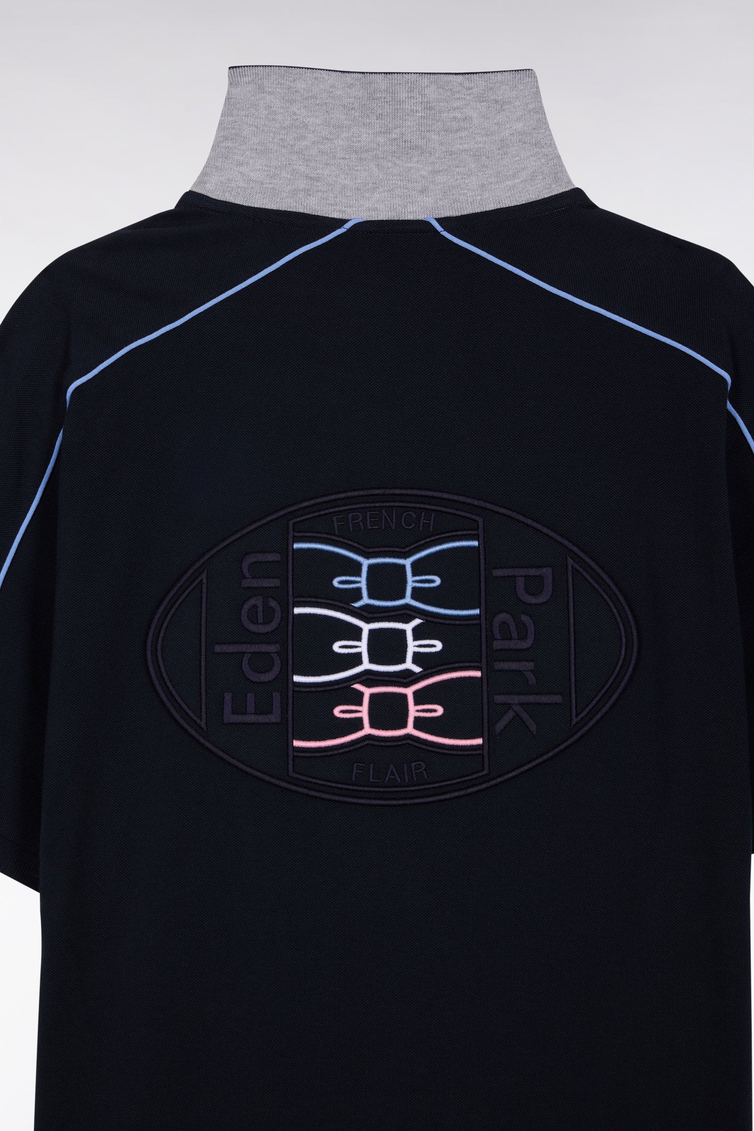 Made from soft cotton pique, this men’s short-sleeved polo shirt features bow-tie embroidery on the back, a tricolor detail emblematic of the Eden Park wardrobe subtly echoed on its colored piping and silicone patch on the chest for an elegant, athletic touch.