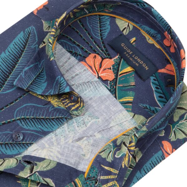 Dive into tropical vibes with our laid-back shirt, flaunting a mesmerizing leaf pattern in fresh green tones and pops of lively orange against a cool navy backdrop. Made from a comfy blend of cotton and linen, this shirt ensures you stay breezy and relaxed, whether you’re lounging by the beach or strolling through the city streets. Get ready to add a touch of island charm to your wardrobe with this effortlessly stylish piece.
